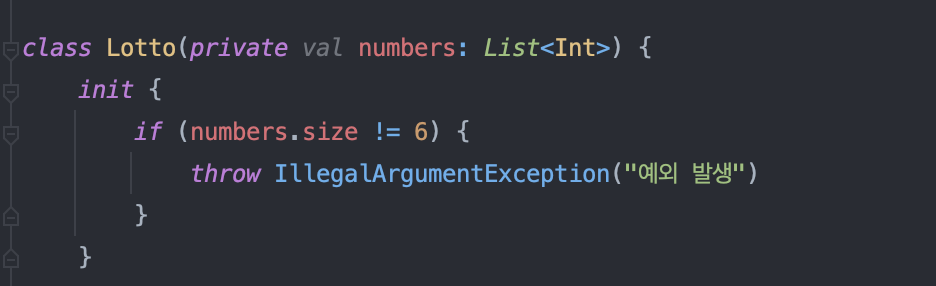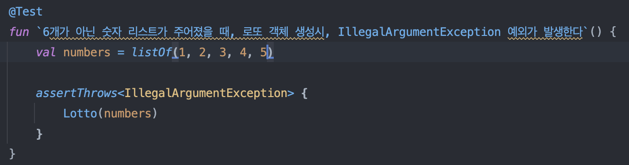이 코드는 숫자의 개수가 5개이기 때문에 Lotto 객체 생성시 IllegalArgumentException이 발생하기를 기대합니다.