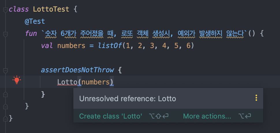 예를 들어, 6개의 숫자로 이루어져 있는 Lotto 클래스의 객체를 생성하는 코드를 TDD로 진행해보겠습니다.