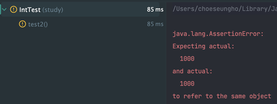 test1과 동일하게 primitive type을 비교한 것인데 왜 해당 테스트 코드는 실패하는 것일까요?