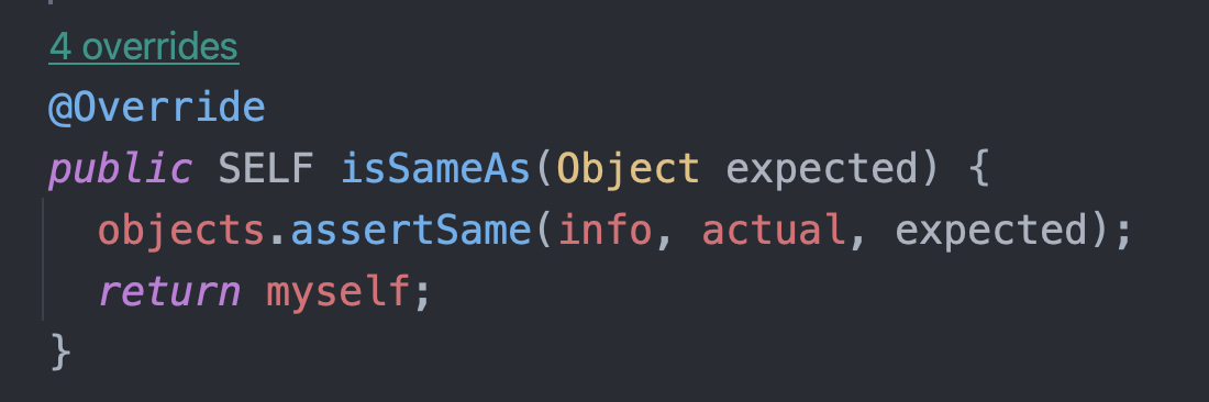 여기에서는 따로 isSameAs()와 같은 메서드를 호출하지 않기 때문에 primitive type 그대로 비교하여, actual과 expected는 동일하다고 할 수 있습니다.