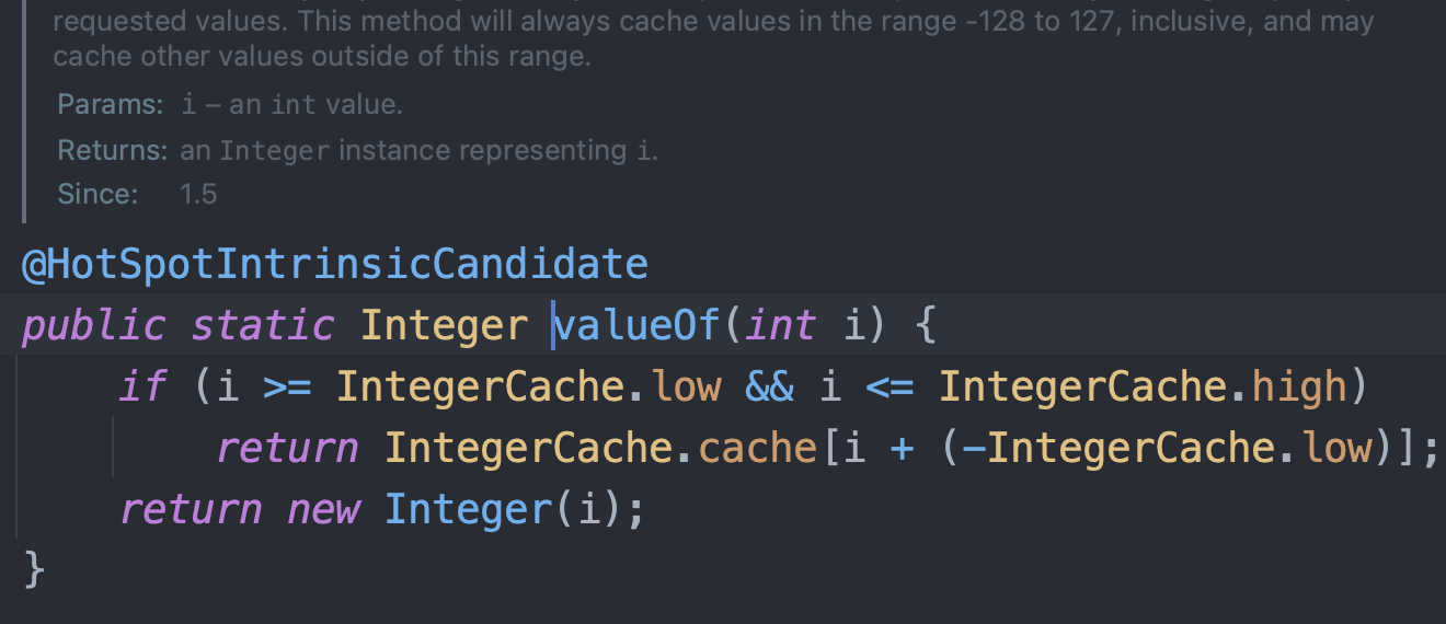 위에 조그맣게 작성되어 있는 설명을 읽어보니 valueOf() 메서드는 -128에서 127 범위의 정수는 캐시를 통해 항상 같은 객체를 반환한다고 합니다.