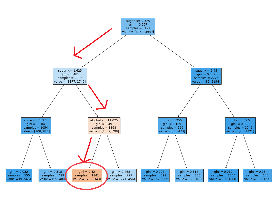 위에서 배운 개념을 적용하여 노드를 해석하며, 이 트리가 레드 와인(음성 클래스)을 선택하는 기준을 살펴보자.