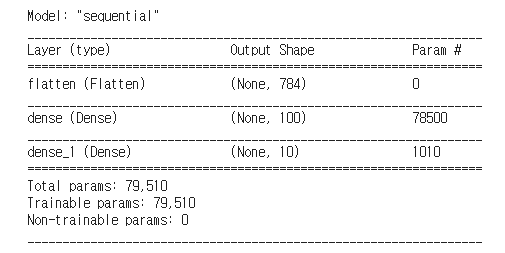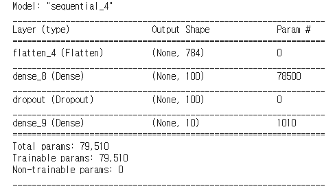출력 결과에서 볼 수 있듯이 은닉층 뒤에 추가된 드롭아웃 층은 훈련되는 모델 파라미터가 없다.