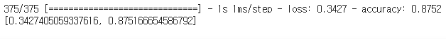 출력해본 결과, 손실(loss)과 정확도(accuracy)가 포함되어 있다.