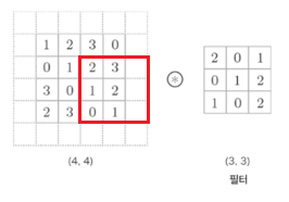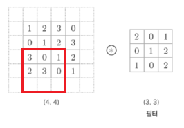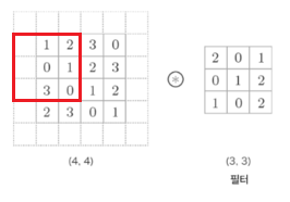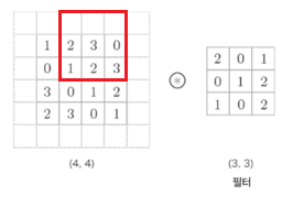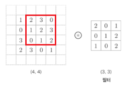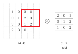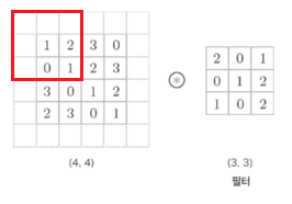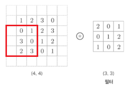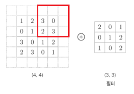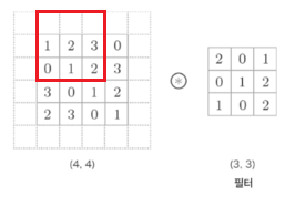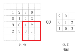 이렇게 한 칸씩 아래로 이동하면서 출력을 만들어내는 것이 합성곱이다.