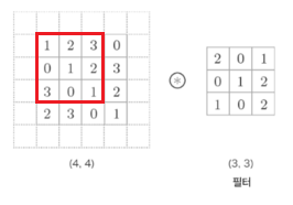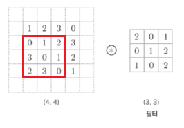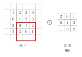 만약 패딩이 없다면 위 그림에서 (4, 4) 크기의 입력에 커널 도장은 처음에 딱 한 번만 찍히게 된다.