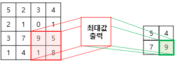 왼쪽에 위치한 (4, 4) 크기의 특성맵에서 최댓값을 출력하는 (2, 2) 도장을 2칸씩 이동하며 찍는다.