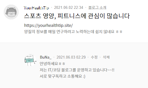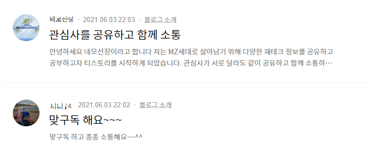 본인 또한 포럼을 자주 이용하며, 스크린샷의 댓글처럼 다양한 블로거들의 게시글에 댓글을 달며 소통하고 맞구독하기 위해 노력하는 중이다.