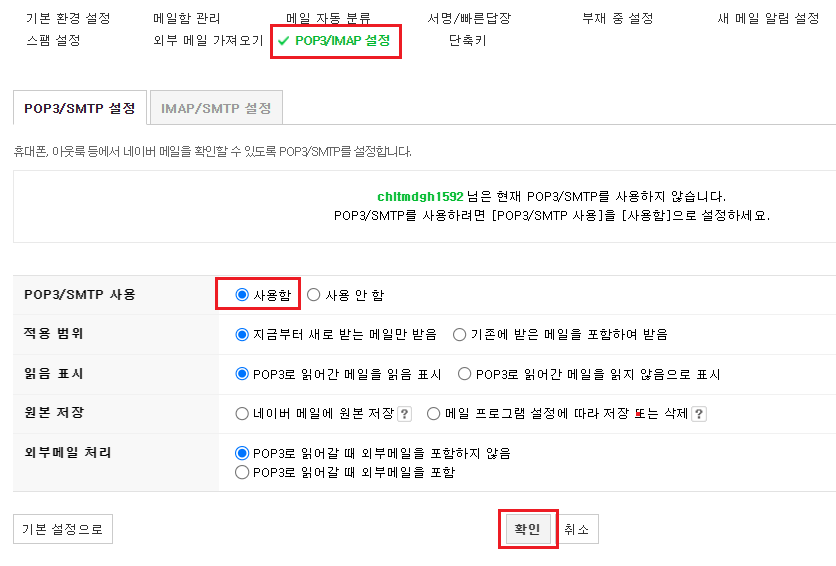 POP3/IMAP 설정으로 들어간 후, POP3/SMTP 사용을 '사용 안 함'에서 '사용함'으로 변경해주면 된다.
