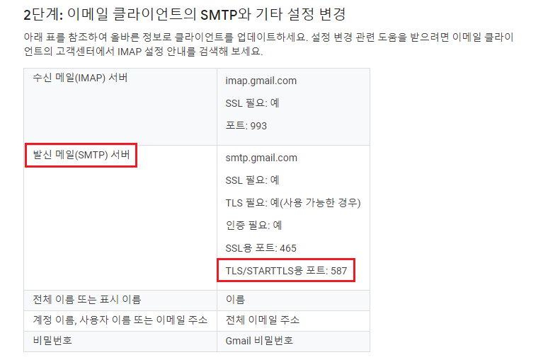 위 그림처럼 Gmail의 경우 TLS용 포트가 587이라고 친절하게 설명해주고 있다.