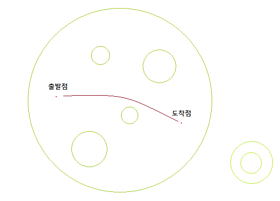 위와 같은 은하수 지도, 출발점, 도착점이 주어졌을 때 어린 왕자에게 필요한 최소의 행성계 진입/이탈 횟수를 구하는 프로그램을 작성해 보자. (행성계의 경계가 맞닿거나 서로 교차하는 경우는 없다고 가정한다. 또한, 출발점이나 도착점이 행성계 경계에 걸쳐진 경우 역시 입력으로 주어지지 않는다.)