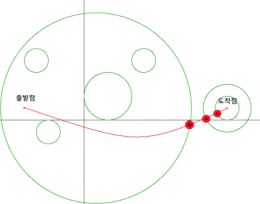그리고 도착점을 보면 2개의 행성 내부에 위치해있기 때문에 어쩔 수 없이 행성 2개에 진입을 해야한다.