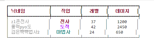 table.add_row('zl존전사', '[b red]전사[/b red]', '37', '1200')
