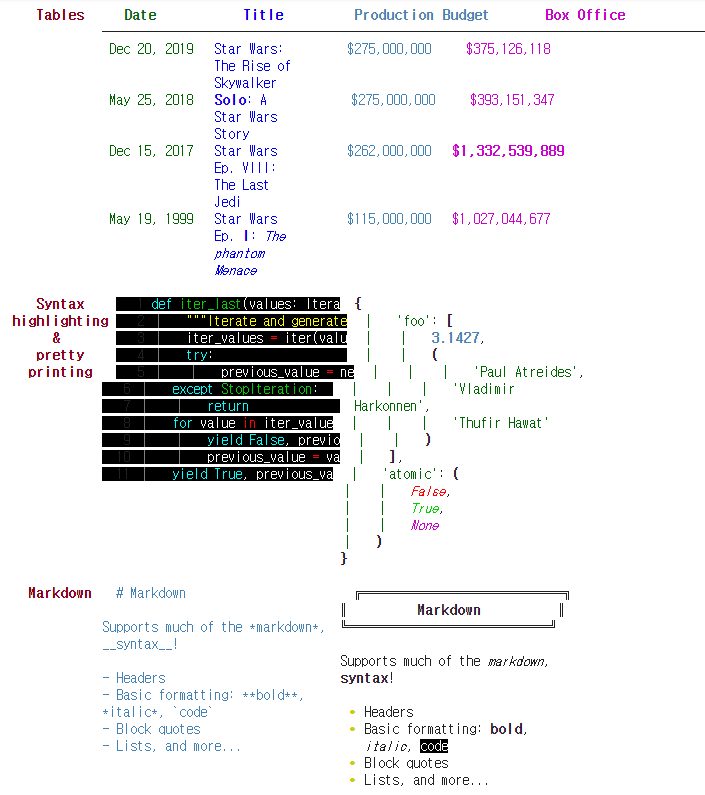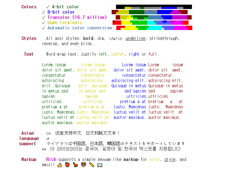 그럼 이렇게 Rich 라이브러리를 사용하여 나타낼 수 있는 기능들에 대해 출력해준다.