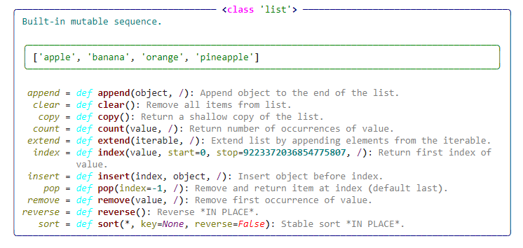 우리는 list 객체를 전달하였기 때문에, list에 있는 요소들과 각종 메소드를 나타내 주고 있다.