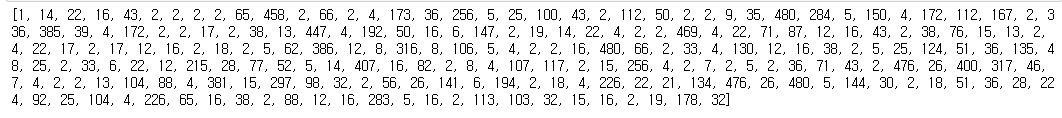 이렇게 리뷰마다 단어의 개수가 천차만별이기 때문에, 모델을 훈련시킬 때 사용할 단어 길이를 통일시켜 줄 필요가 있다.