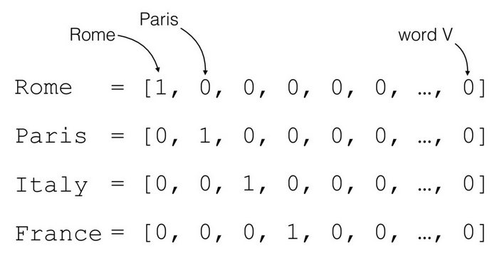 Rome이란 단어는 첫번째 요소가 1이고, Paris는 두 번째 요소가 2이며 아래 단어들도 각각 고유한 인덱스에서 1을 가지고, 나머지 요소들은 모두 0 임을 알 수 있다.