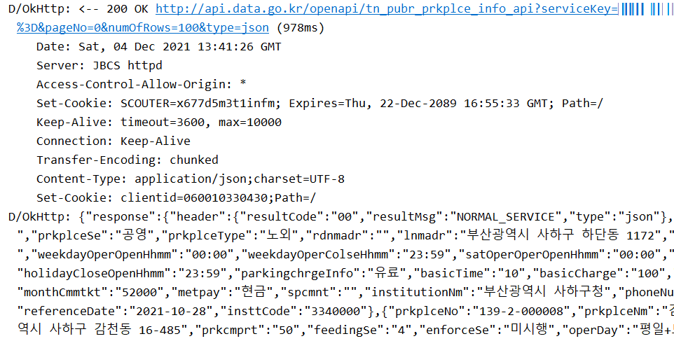공공 데이터 포털에서 result code를 확인한 결과 "00" 일 경우에만 정상적으로 데이터를 가져온 것이므로, 데이터의 주차장 이름만 가져와서 로그를 찍어보았다.