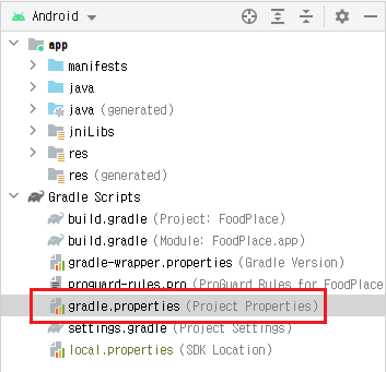 우선 Gradle Scripts -> gradle.properties를 열어준다.