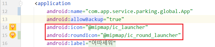 그리고 안드로이드 스튜디오의 Manifest파일에 들어가보면, 이렇게 아이콘을 설정할 수 있는 곳이 있는데,