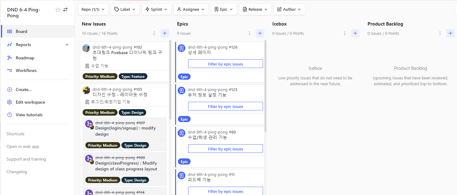 그리고 처음으로 ZenHub를 사용하여 프로젝트의 Issue 생성/관리를 해보았습니다.