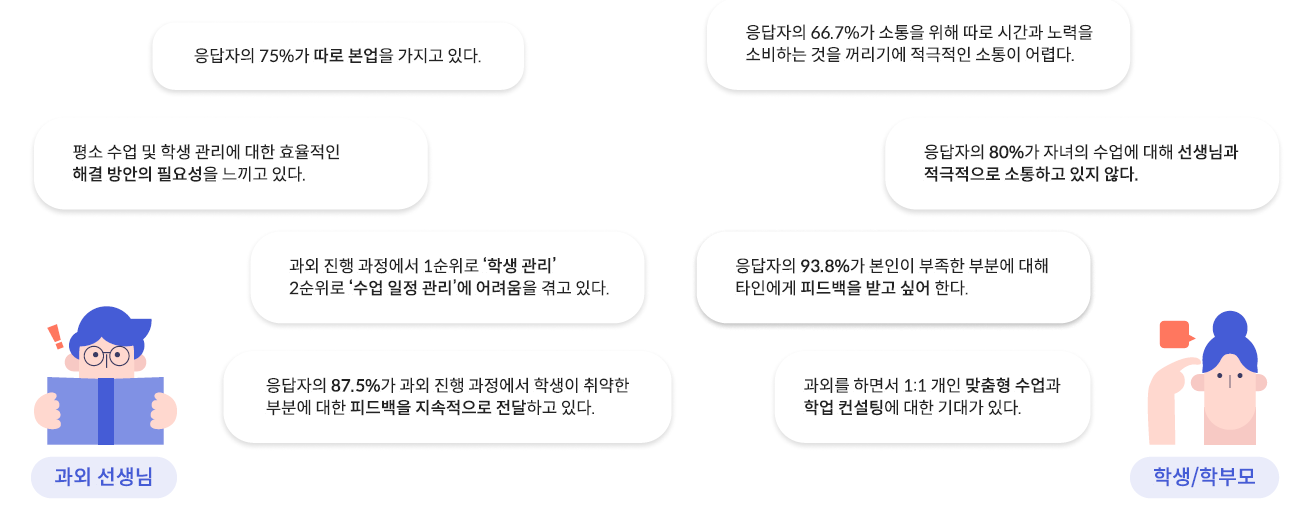 과외 대상을 매칭해주는 서비스는 많지만, During 과정에 존재하는 PainPoint를 해결할 수 있는 서비스 없었기에 핑퐁을 기획하게 되었습니다.