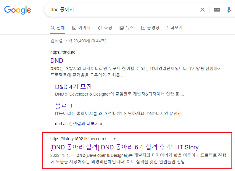 이전에 활동을 시작하면서 작성한 포스팅은 DND 동아리를 검색하면 최상단에 위치하고 있습니다.