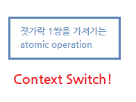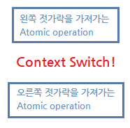 위 그림은 왼쪽 젓가락을 가져가는 Atomic operation을 수행하고 나서, Context switch가 발생하여 다른 프로세스에게 CPU가 넘어간 상황입니다.