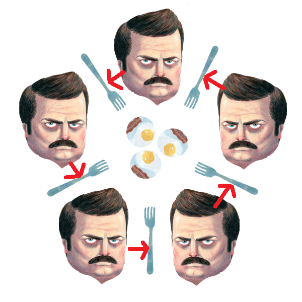 애처롭게도, 철학자 사이사이에 젓가락은 하나씩만 주어집니다.